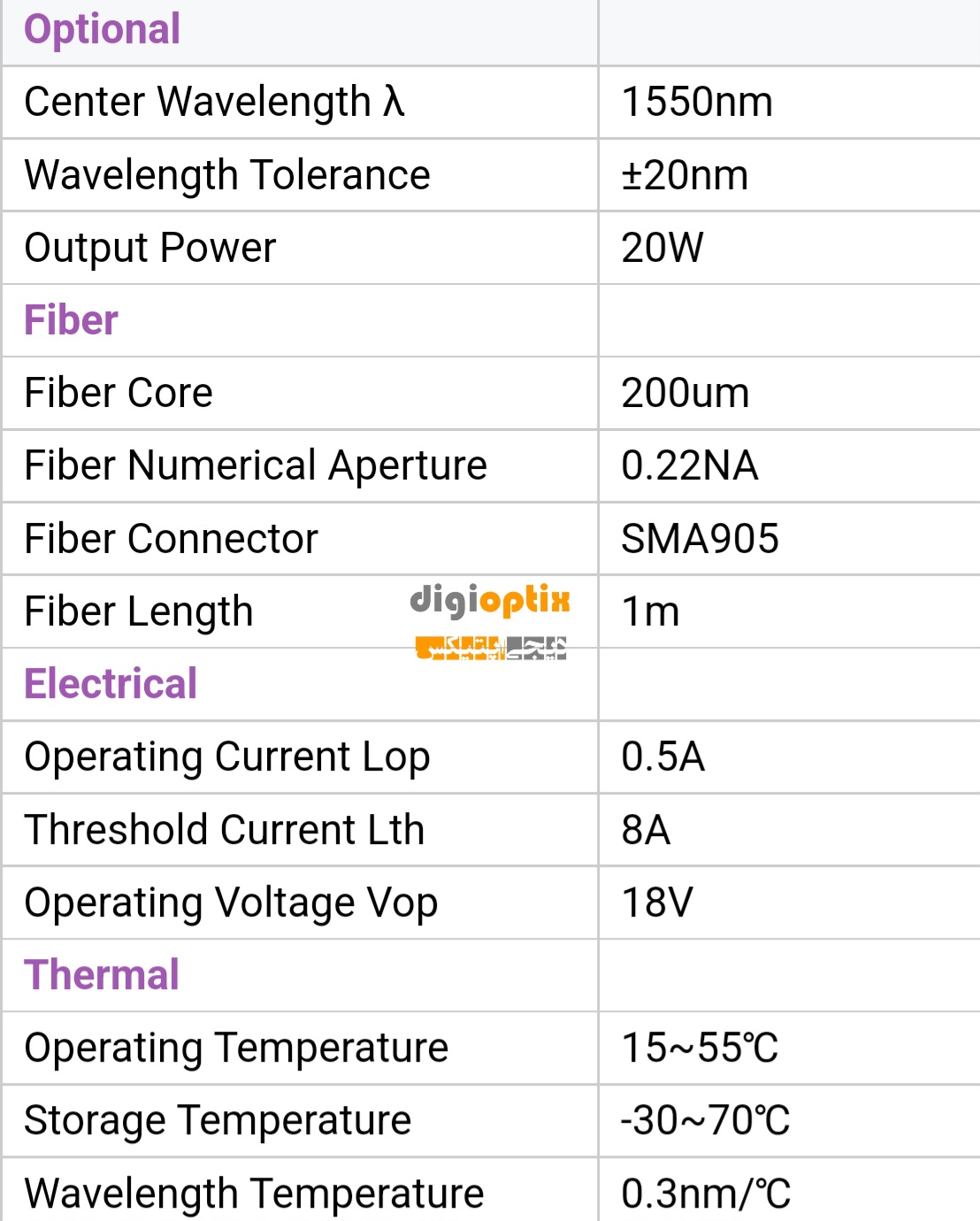 توان خروجی 20 وات در طول موج مرکزی 1550 نانومتر