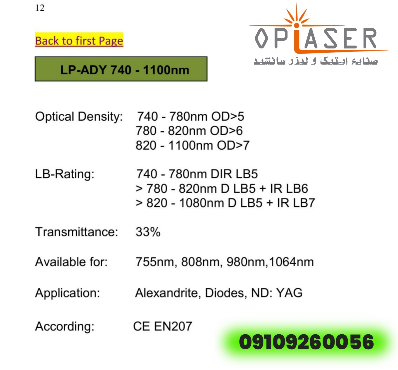 - Optical Density : 740-780nm OD+5، 780-820nm OD+6، 820-1100nm OD+7