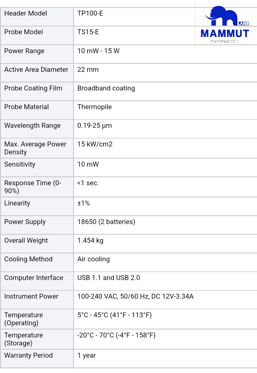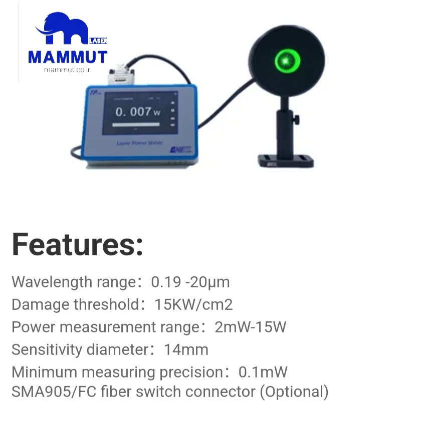 حداکثر توان اندازهگیری: این دستگاه میتواند توان لیزرها را در رنج توان حداکثر ۱۵ وات اندازهگیری کند. این توان برای لیزرهای صنعتی و کاربردهای تحقیقاتی در حوزههایی مثل برش، جوشکاری و درمان پزشکی مناسب است.