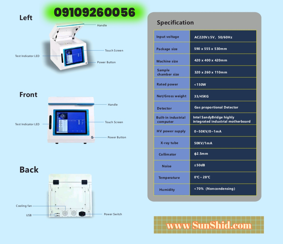 این دستگاه آنالایزر پرتابل فلزات گرانبها (Precious Metal Analyzer) است که با روش فلورسانس پرتو ایکس (XRF) کار میکند. مشخصات و ویژگیهای آن طبق تصاویر شما به صورت زیر است: